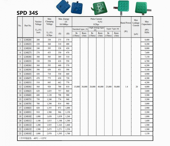 5. Maximum energy: the maximum impact energy that can be applied to the varistor under the condition that the varistor voltage does not change more than ±10% and the impulse current waveform is 10, 1000μs or 2ms.