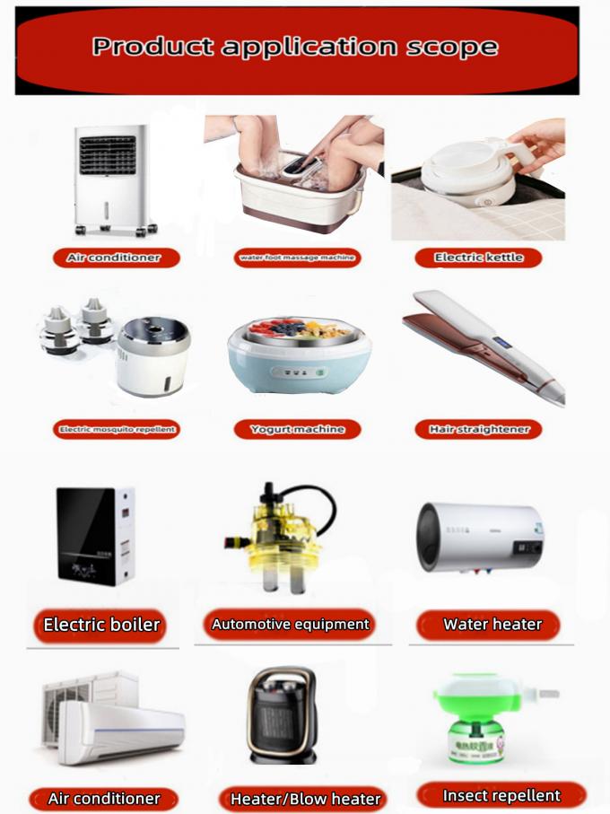 Heaters, air conditioning heating, clothes dryers, mosquito killers, motorcycle carburetors, car cold start preheating, electric humidifiers, moisture-proof electrical instruments, electric hot plates, massagers, thermotherapy instruments, glue guns, curling hair, Hair straightener heating, hot coffee machine, milk warmer, boiling water, water heater, steam beauty, etc. When the product terminal temperature is below 260°C, PTC heating can be used to maintain a constant temperature without temperature control. It has a compact structure and long service life, which has great advantages.